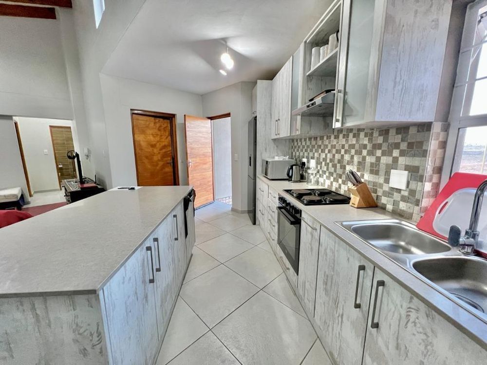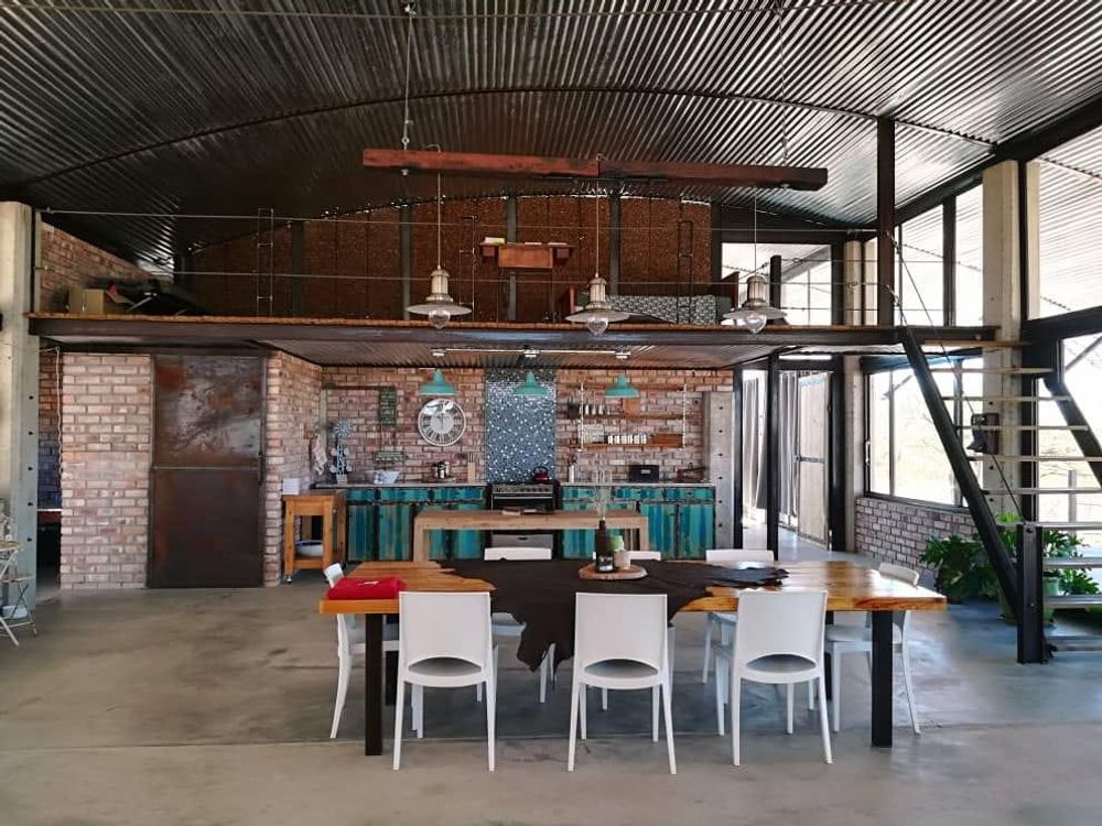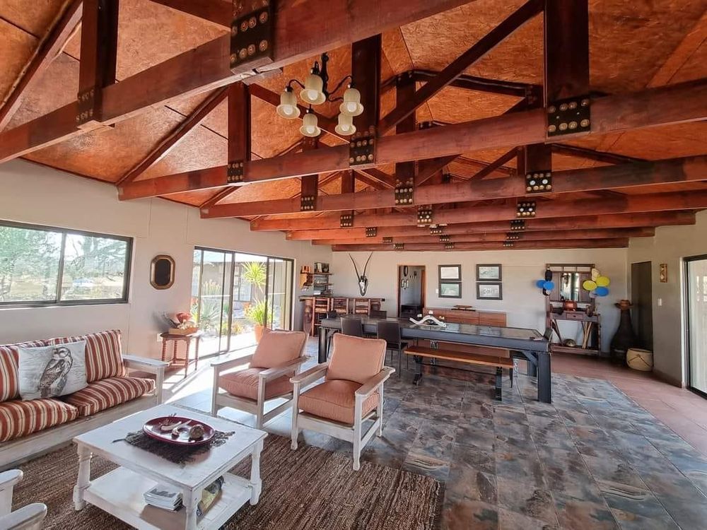 The main dwelling on the farm is an architectural marvel, featuring a covered stoep and wooden deck with a built-in BBQ, a sparkling swimming pool and an open living area/dining TV area. The kitchen is open-plan with a scullery and pantry, and there are three bedrooms - one with a full en-suite bathroom and two with en-suite shower/WC/basin. A study on the upper deck offers a peaceful space for work or relaxation.