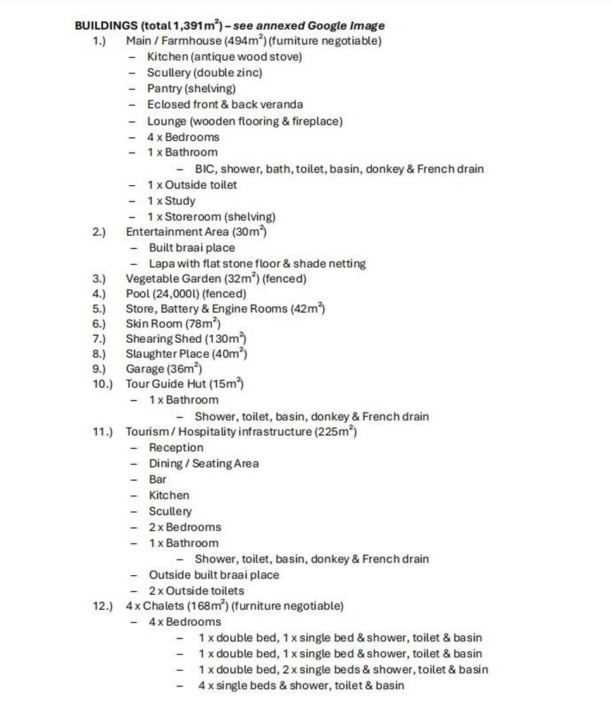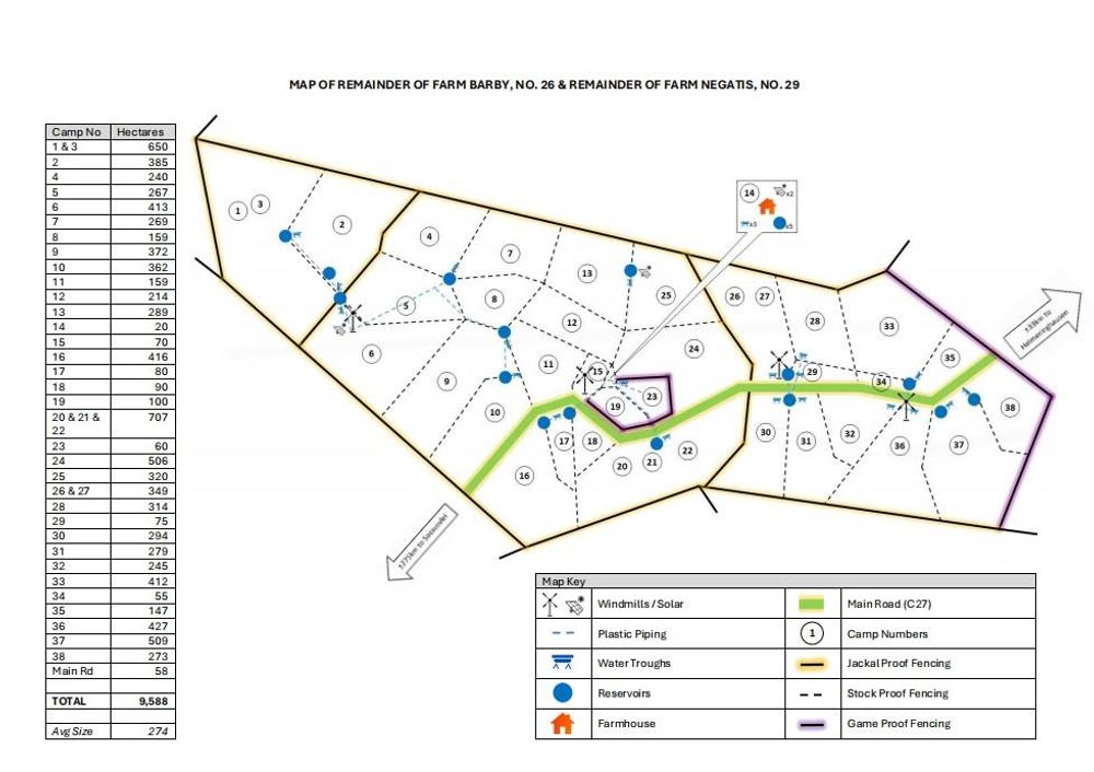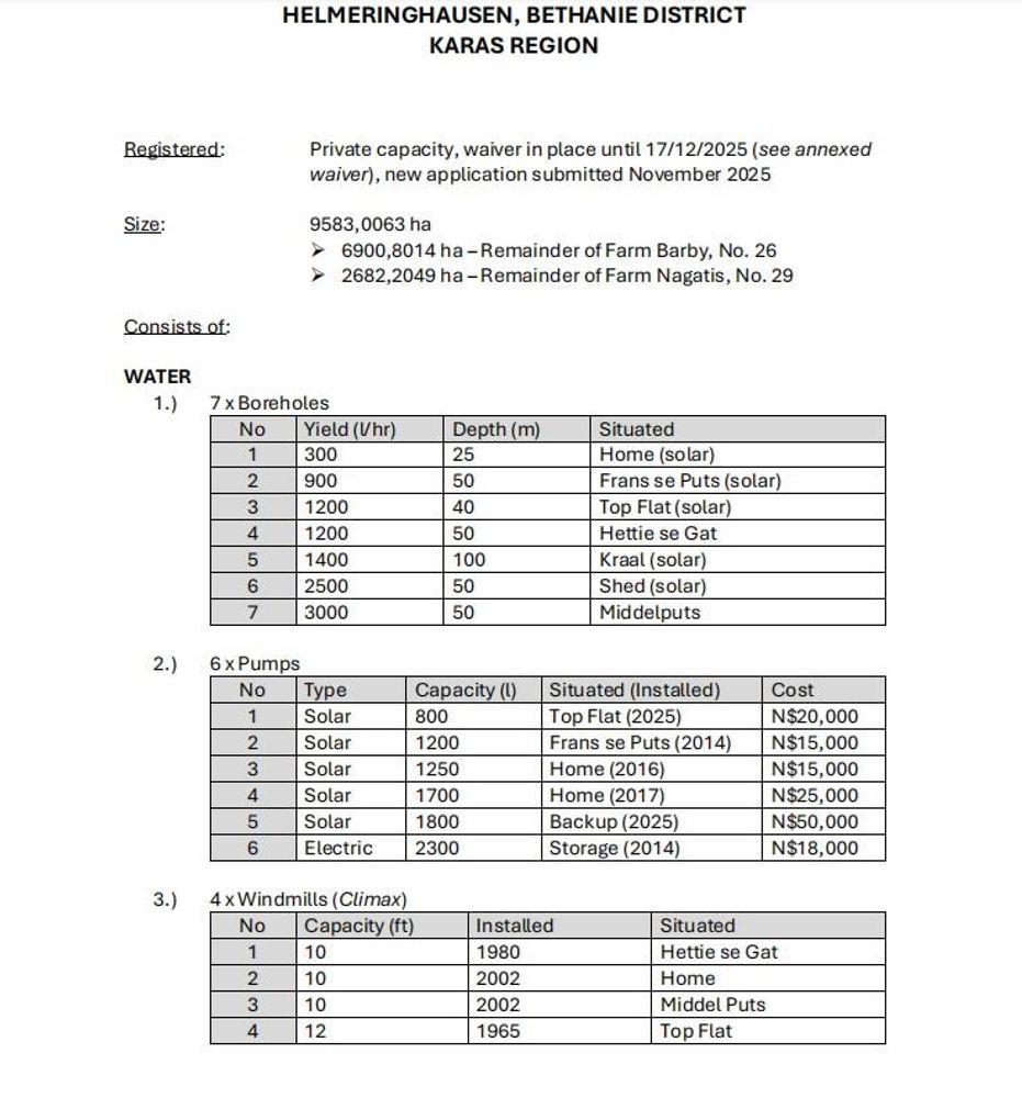 A rare opportunity to acquire a fully operational, large-scale farm combining cattle, sheep, and game farming with an established tourism and hospitality business — all in one of Namibia's most scenic and unspoiled districts. Spanning nearly 9,600 hectares across two registered titles, this is an incredibly well-watered, well-fenced, and comprehensively developed property ready to work from day one. With 34 rotational camps, 7 boreholes, extensive solar infrastructure, a 4-chalet guest lodge, campsites, a full bar and dining facility, and free-ranging game, this is a true multi-income producing farm.