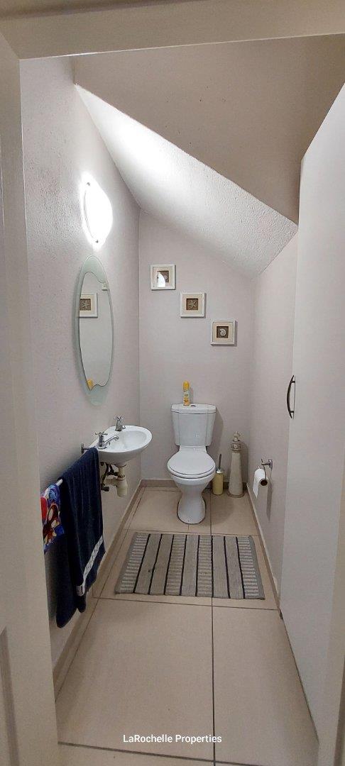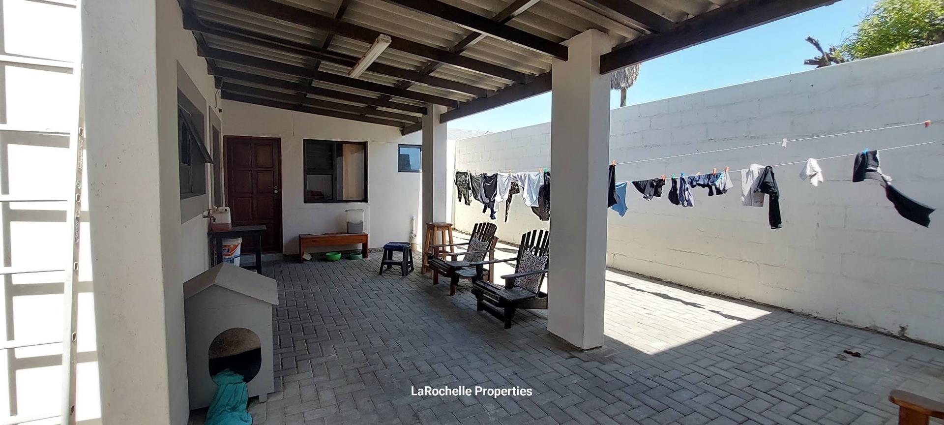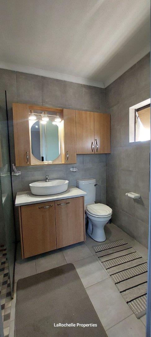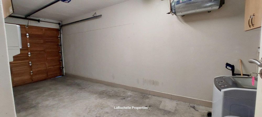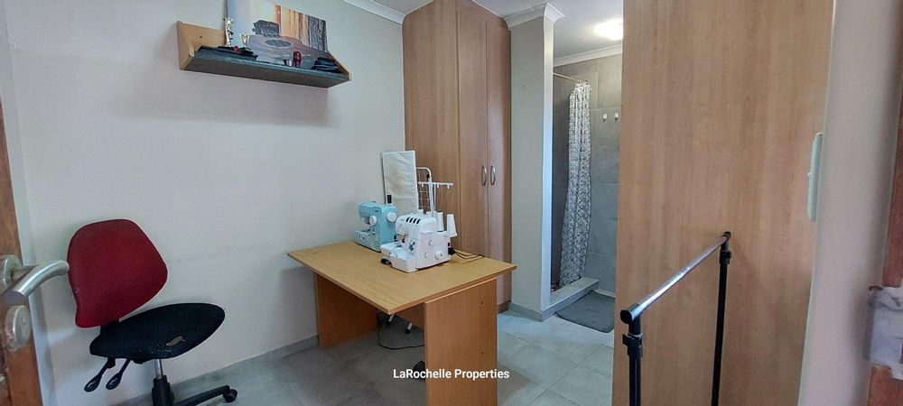 The ground floor also includes a single remote-controlled garage that accommodates a double cab bakkie and provides fittings for a washing machine. Additionally, there is a separate carport for an extra vehicle and a versatile workroom/small office space. An alarm system ensures your peace of mind.