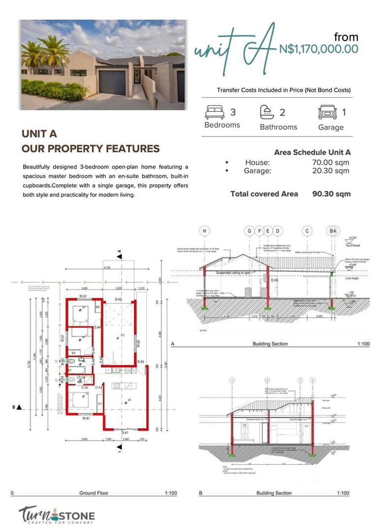 🔹 Unit A – Priced at N$ 1,170,000, this unit boasts 3 bedrooms, 2 bathrooms, a single garage, and spans 90.3 sqm.