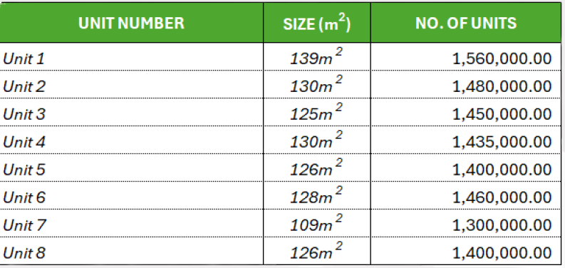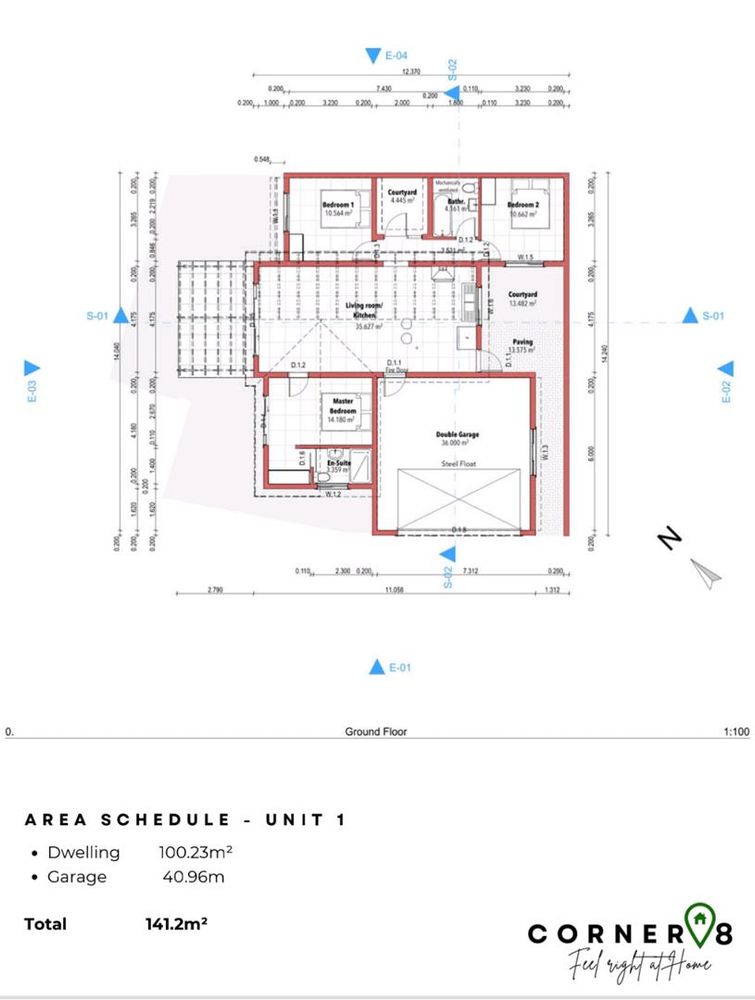 - Unit 1: 100.23 sqm of living space + 40.96 sqm double garage + 2 courtyards