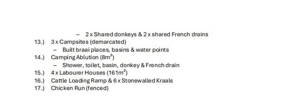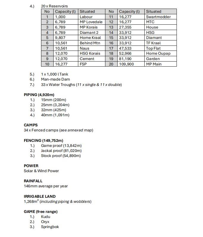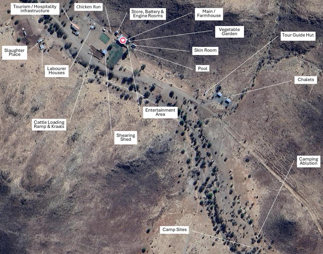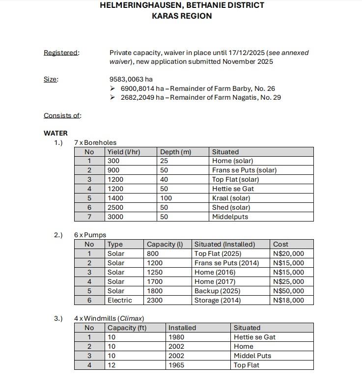 A rare opportunity to acquire a fully operational, large-scale farm combining cattle, sheep, and game farming with an established tourism and hospitality business — all in one of Namibia's most scenic and unspoiled districts. Spanning nearly 9,600 hectares across two registered titles, this is an incredibly well-watered, well-fenced, and comprehensively developed property ready to work from day one. With 34 rotational camps, 7 boreholes, extensive solar infrastructure, a 4-chalet guest lodge, campsites, a full bar and dining facility, and free-ranging game, this is a true multi-income producing farm.