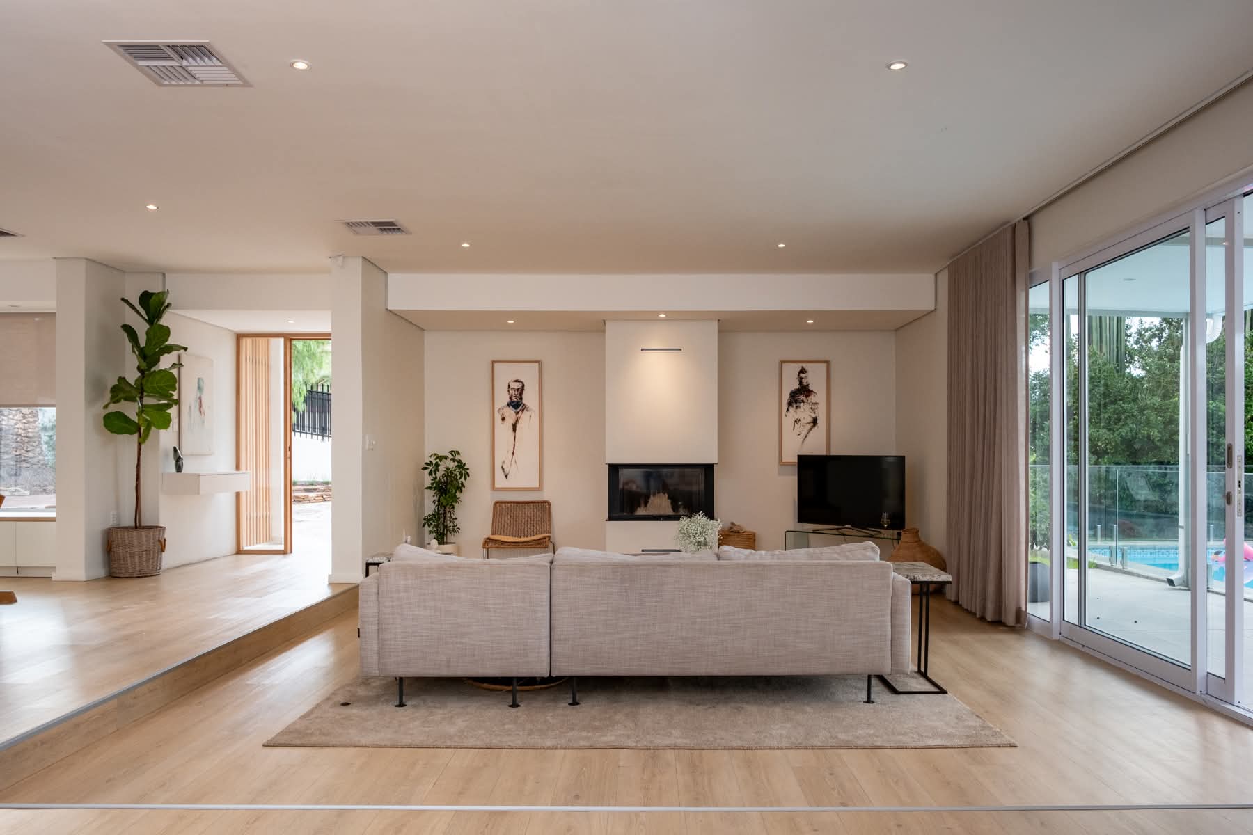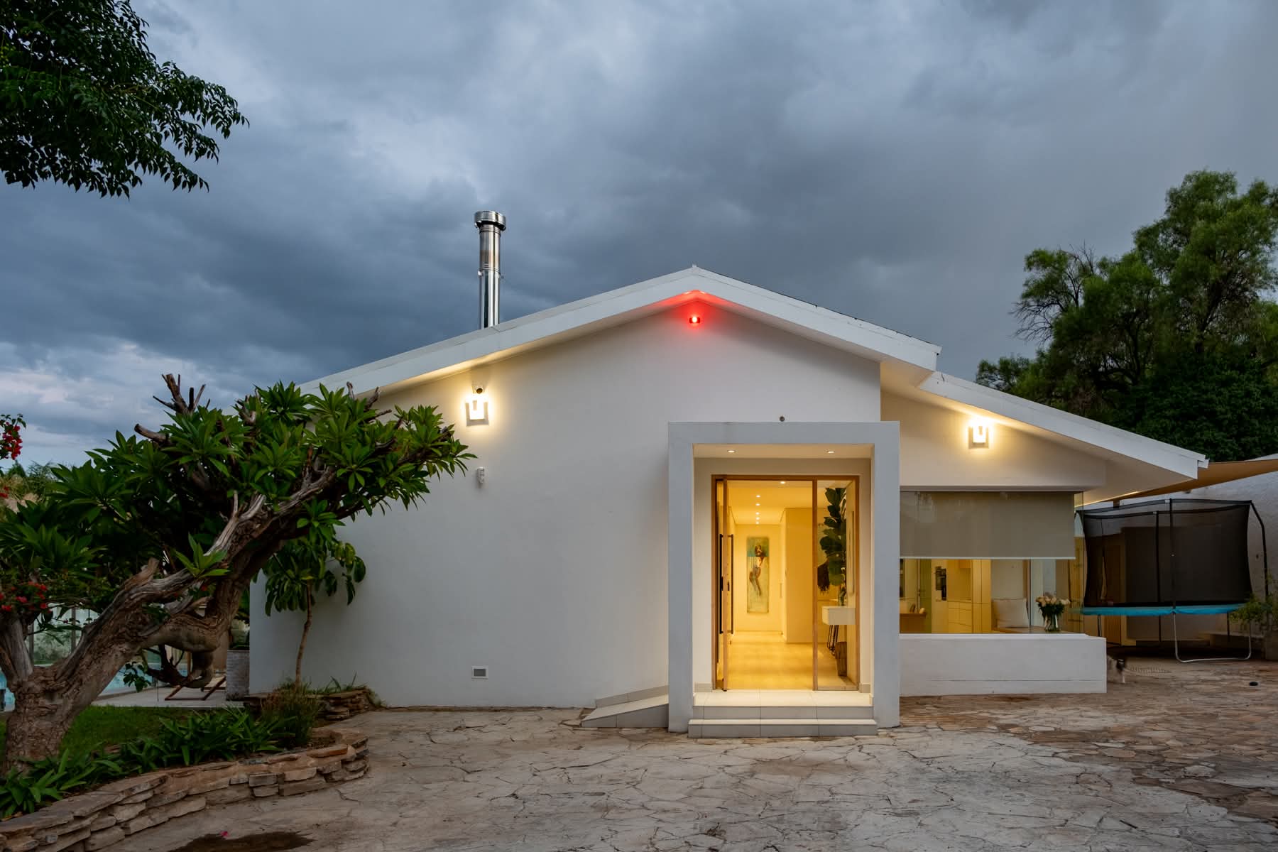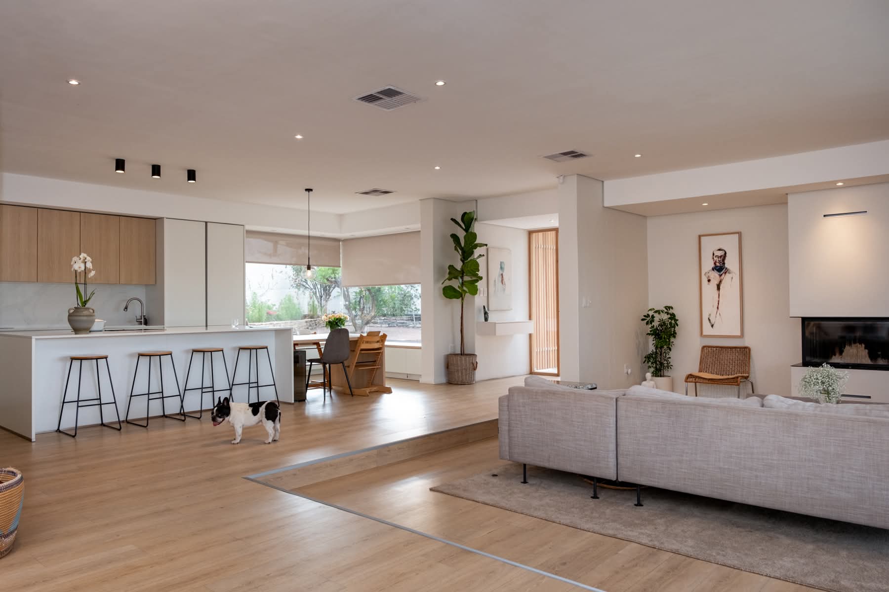 Step inside to discover a spacious and elegant interior featuring four bedrooms and three bathrooms. The open-plan kitchen, living, and dining area is perfect for entertaining, anchored by a stunning German designer kitchen. Enjoy the warmth of a large glass fireplace and the convenience of a central air cooler system. The solid oak pivot front door and exquisite oak kitchen and bathroom interiors add a touch of sophistication. The home also features German vinyl flooring, a scullery, and a laundry room.