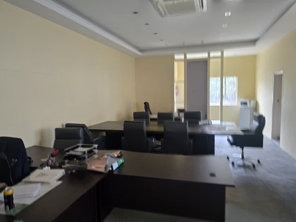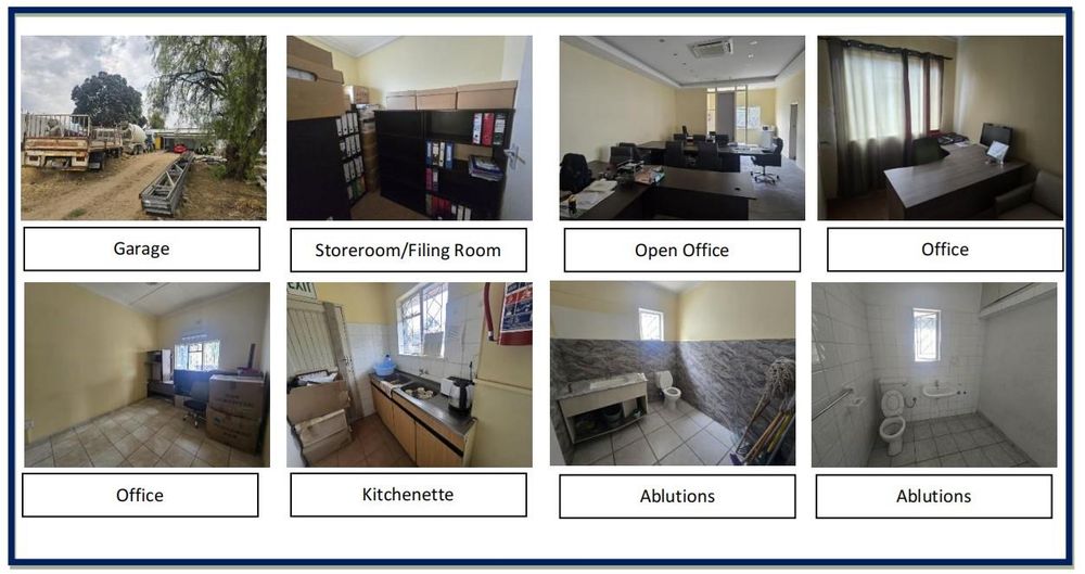 The property currently features a functional office setup including multiple offices, open-plan workspace, flat, garage facilities, storeroom, ablution facilities, and secure parking — ideal for immediate business occupation or rental income generation.